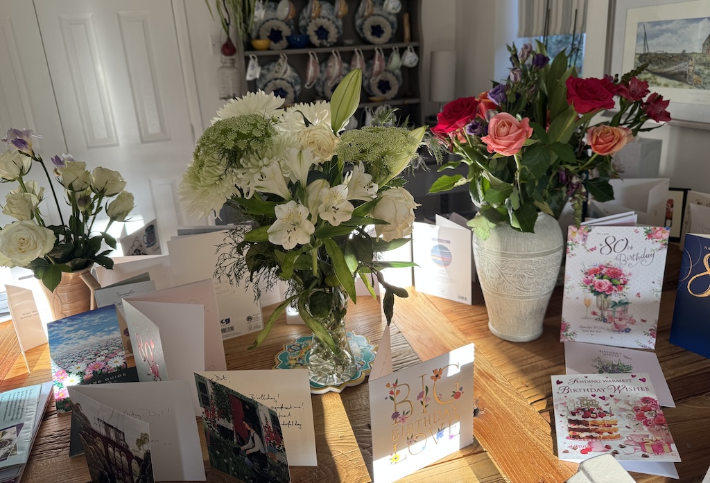 Antibiotics had to be taken with food, which was awkward because I wasn’t hungry. Discovered later in the day that I’d forgotten to take my usual pills both yesterday and today. Colin is making progress with the wall, and Dot had a long visit from Nikki. Lots of nice messages from others, and Des also came over, together with Mark and Sarah with flowers, drink and chocolates for her birthday. Really kind. Later Dot went over for indoor street meet at Des’s, and I found a card to give her. Not exactly what I’d planned. Put off Parish Pump, thank goodness, in view of what followed.