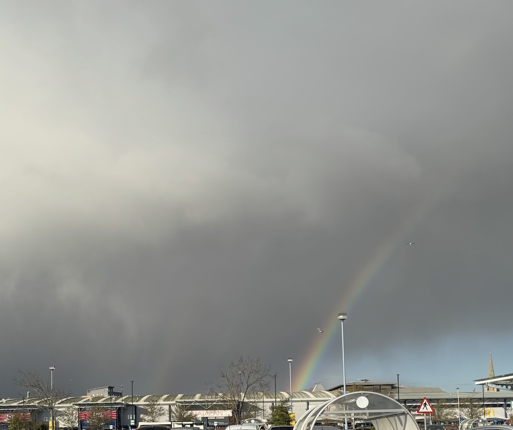 Tuesday – showers; cool. Rainbow over Morrisons. Bridget came to clean “as a friend”. Paid her as usual. While she was here I put petrol in the car and bought some food from Morrisons. Not as crowded as I thought it would be. We rang surgery on advice from Bridget or someone else, and they have arranged transport for next Monday despite our giving the wrong time for the appointment (corrected later). In the afternoon Leanne brought some wine and chocolates and had a chat with both of us in the bedroom. Her partner Rosco came to the door because she’d left her phone downstairs and he couldn’t reach her: she was supposed to have met him from the station. He seemed fine; Leanne is amazing, coping with all sorts of problems. Most of the day Dot seemed much better, but she had pain in the evening, possibly because she missed some pills. I cooked some salmon and stewed blackberry and apple. Felt very tired for some reason. Put rubbish out.