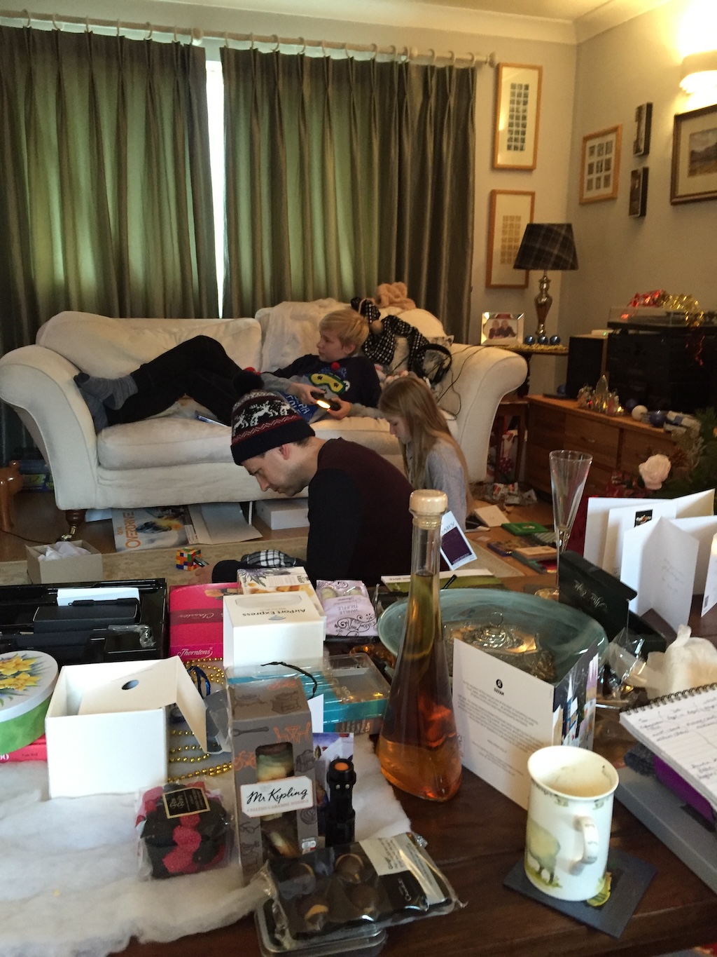 We then went to the post office in Thunder Lane, where we sent off Amy’s parcel and bought a few more stamps. Then home, but passing Lionwood by chance, we picked up some extra sugar, after Dot had managed to force entrance. Only eight bags…. After lunch Dot was  preparing to go to a violin lesson, but got a message from Anna saying she was in agony from knee arthritis; so instead she went on wrapping presents. I tidied and also wrapped a bit, but felt very tired; so lay down for a while. Had pizza for supper, then watched the last episodes of Down Cemetery Road, which was pretty good. Rather late in bed. Only 1600 steps, amazingly. Oliver has arrived in Waterloo.