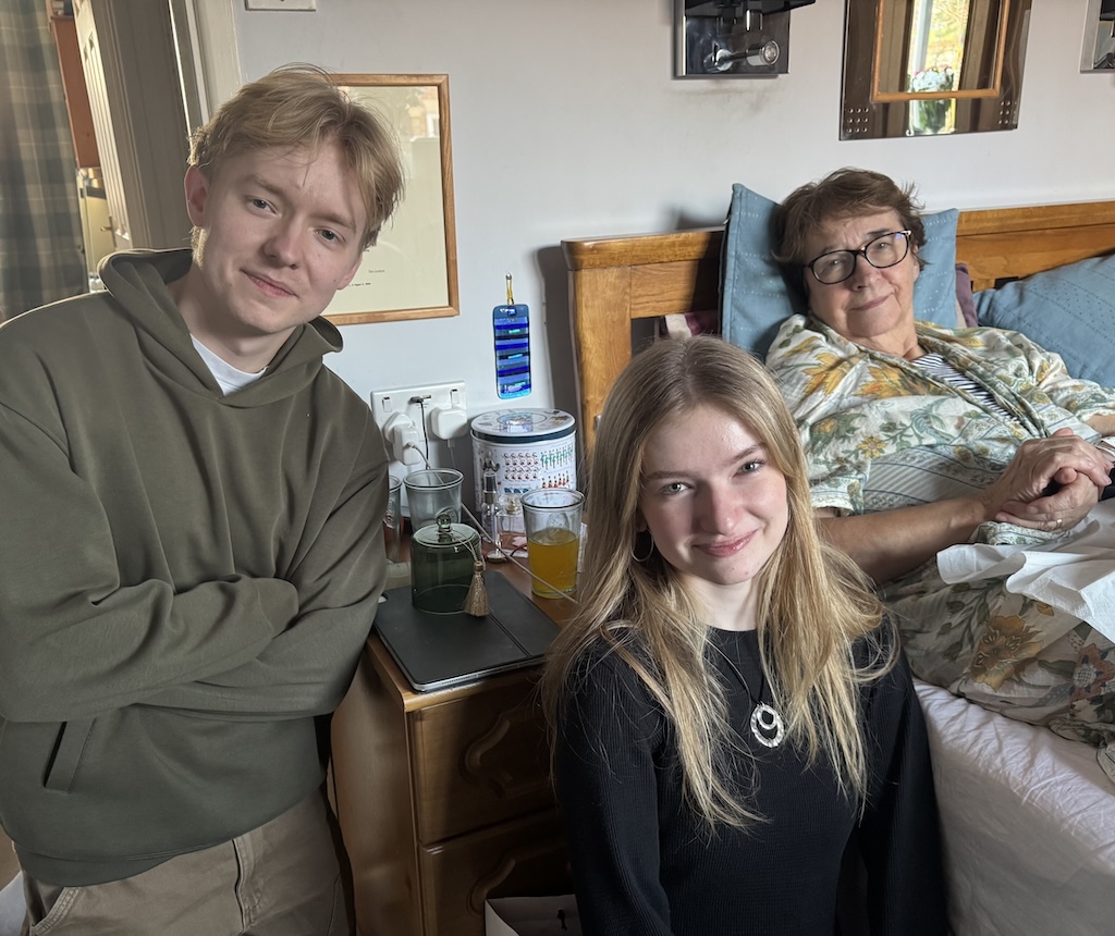 The idea was that I would go home and be ready for when the ambulance arrived with Dot. So I went home, and after many hours I (and Oliver) noticed she was on the move, and they arrived around 10pm. After reconnoitring they managed to get her into the chair and into the house, depositing her on the bed. She was in surprisingly good spirits. Or maybe it was the painkillers.