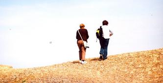 Two intrepid climbers near the summit of the previously unclimbed Mount Shingle, on the North Norfolk coast, during their trek across the uncharted Cley Marshes – known in some quarters as the Empty Miles. This was a two-woman expedition, totally unsupported except for the cameraman, his friend and the occasional coffee and ice cream.