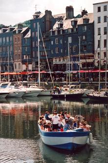 Tuesday we did manage Etretat, and on Wednesday it was Honfleur.We took the green bus from just up the road, which went along the coast, then dipped inland. My stomach was feeling gassy, but shortly after arrival we had mint tea at a pavement cafe which seemed to settle it completely: the tea had actual mint in it and was delicious. Walked around the town a bit and then had lunch – a €23 four-courser. Mine was delicious – foie gras, steak, cheese, sorbet – but unfortunately Julia’s was very disappointing, and everyone who had fish (ie everyone but me) agreed that the sauce was excessive. Visited one or two exhibitions afterwards and walked up into the old town (actually it’s all old) away from the harbour,calling at a few exhibitions and shops. Lovely place. Julia on unsuccessful quest for licorice ice cream, which was supposed to be sold by the harbour. Eventually got the bus back at about 6 and changed at Deauville.