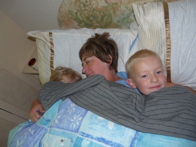 Three in a bed, and the little one hid up. Dot and grandchildren in the West Runton caravan.