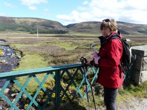 Persistently showery. Down to Glen Muick: set out at about 11.30 in brief sun for eight-mile walk round the loch, starting with bridge and beach at its head. The footbridge seemed a bit the worse for wear, sagging in the middle. I empathised. Firm soggy wind against us. Picnic by beach at Allt Glas Shiel, then ever onward. Wind behind us as we turned for home, but as we did so the rain stopped and it turned quite pleasant. Feeling pretty tired towards end. Herd of deer in the valley busy feeding. Couple of lapwings. Workmen refurbishing toilets. About ten French caravettes en route intermittently for Spittal of Glenmuick: some kind of convention? Drove to Crannach for tea and scones, then to Cambus O’May (means bend in the river on the plain) for look at suspension bridge. Then home. Pause at the moment while we contemplate buying fish and chips.