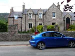 After this the roads were beautiful again, and we headed for our favourite cafe at Ballathie, only to find it shut. So we motored on, with me driving now, and eventually reached Braemar, where it was wet and much colder. We stopped at the Fife Arms for our customary sandwich, served by the customary delightful East European waitress.