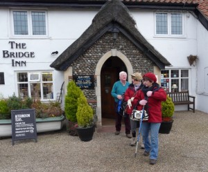 Dave, Julia and Dot exit the Bridge Inn at Acle to continue the last part of our walk.
