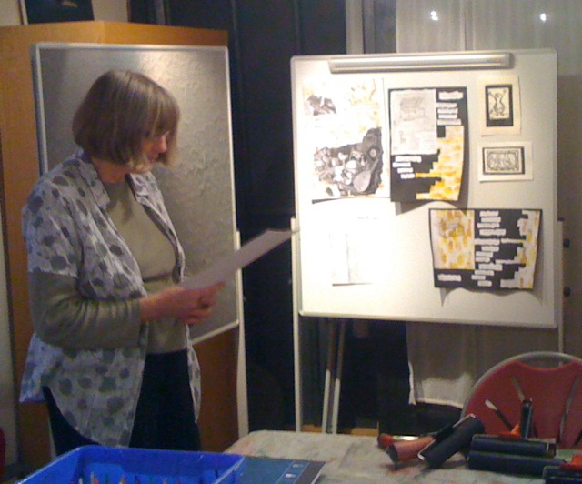 Diane Jackman Lee reads her poem out at the end of the poetry-art workshop at Dragon Hall. Completed work on board.