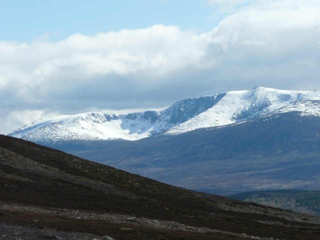 It was warmer than recently, but there was still a chilly wind against us most of the way out and it strengthened as we climbed towards Am Bealach. So it was quite hard going – but the views towards snowy Lochnagar were spectacular. On the walk back there was plenty of standing water to circumnavigate, and by the time we reached the road I was feeling pretty tired.