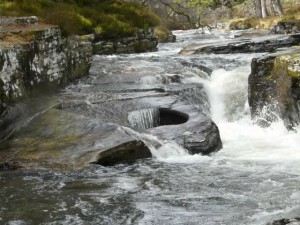 We called in for late lunch at the Fife Arms, and Dot checked her e-mails again, finding one from Barbara M that was four days old. Drove back to Ballater, picked up the DVDs and, as it was sunny, drove up towards Glen Muick to park and read. After I finished my book, Cairngorm John (about mountain rescues) we decided to walk and drive instead: Dot walked for ten minutes; I caught her up and then I walked for ten minutes. Amazing how far you can get in ten minutes. We ended up near the Falls of Muick and walked down to get a closer look. As we got back to the car it started to rain, and as the road entered the open glen, it started hailing. It was that sort of day.