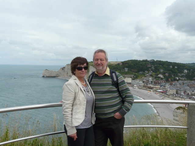 Tuesday was also mainly dry, though cloudy. Dave drove us to Etretat via le Pont de Tancarville, which is cheaper than le Pont de Normandie, but not so pretty. Etretat was wonderful, though: amazing cliffs. Had lunch in different restaurant from last time: moules marinieres et frites and some wonderful cidre brut. Then on to Fecamp, where we visited the Benedictine palace/distillery, with free sample at end: I had Benedictine and Brandy cocktail, or B & B, as it’s sometimes known, followed by a swift crepe. Walked about three miles altogether. Salady meal with the Evetts in evening.