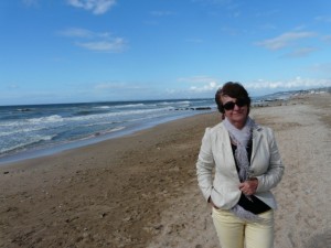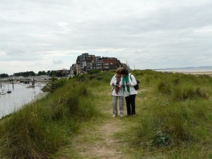 Next day was Friday the 13th, but despite that it was a much better day – dry till evening. Went into Villers in the morning, and Dave and I had a brief walk in a muddy wood (part). Dot bought a waterproof jacket in the market and we got some wonderful Normandy pâté, which we had for lunch. In the afternoon we drove to Cabourg, where we had a lovely walk along the spit of land at the side of the estuary – mainly dunes featuring wildflowers that fascinated Julia and Dot. They had a book.