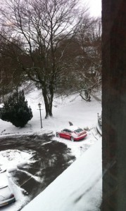 View from bedroom window yesterday morning, with Dave removing snow from his car