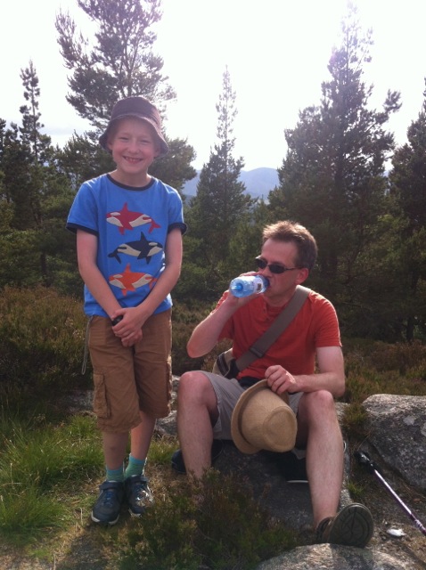 Warm and dry. While Roger and Barbara walked Seven Bridges and the others went to the river, Dot and I went into town and bought me some binoculars (birthday present) for £170, a top and scarf for her and some meat for supper. Had drink and muffin at cafe, sitting outside! In afternoon I played cricket with Oliver, David and Roger while others went to river again, then – after a brief break – Dot and I, Roger and Barbara and Oliver climbed Craigendarroch. David met us on top, having started later and gone a long way round. We all returned by another route I recommended, despite much doubting by others. But it worked well. After supper watched more Twenty Twelve.