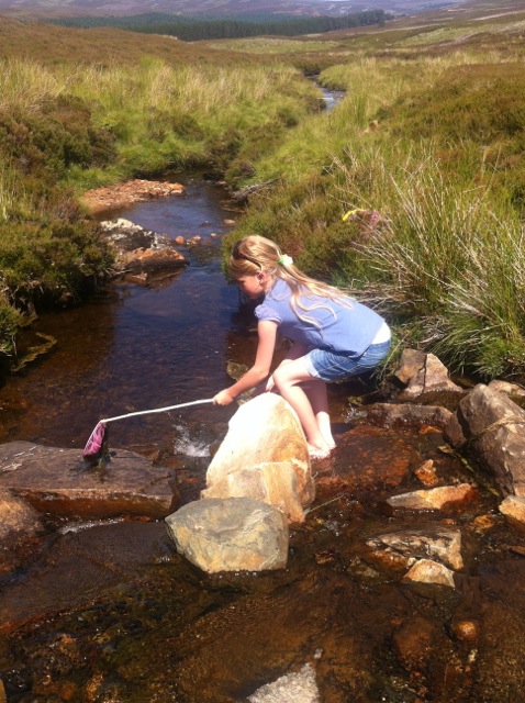 No reduction in warmth. Five of our number set off under blue skies at 7.55am to climb Lochnagar but had to retreat from the ridge at about 1pm, feeling exhausted under the hot sun. Meanwhile, Dot, Amy and I played storytelling using Dixit cards, then went to the little bridge off the Corgarff road to play in the stream (at least, one of us did). Idyllic spot. Managed to receive a call from Coventry about Andrew as well as a couple of texts from David to say they’d turned back. We eventually drove back to Spittal of Glen Muick to meet the Lochnagar party as they arrived, rather tired in the sun. Good achievement, though – especially by Oliver. Fish and chip supper.
