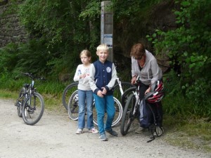 Cyclists Amy, Oliver and Dot pause at Cambus O’May