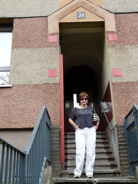 After quite a good night’s sleep had a reasonable breakfast, then headed out in the sun to Dot’s birthplace – 24 Waterside Road – which we found without much difficulty about a mile away. The road is still there, bordered by the River Clyde, but the houses look a bit newer, though the area is clearly still less than affluent. Took pix of Dot on her second appearance in the Gorbals, then we crossed Ballater Street (and the river) into Glasgow Green, a beautiful park containing the People’s Palace and the Winter Gardens, where we had an ice cream and visited a museum with some wartime memories of the area.