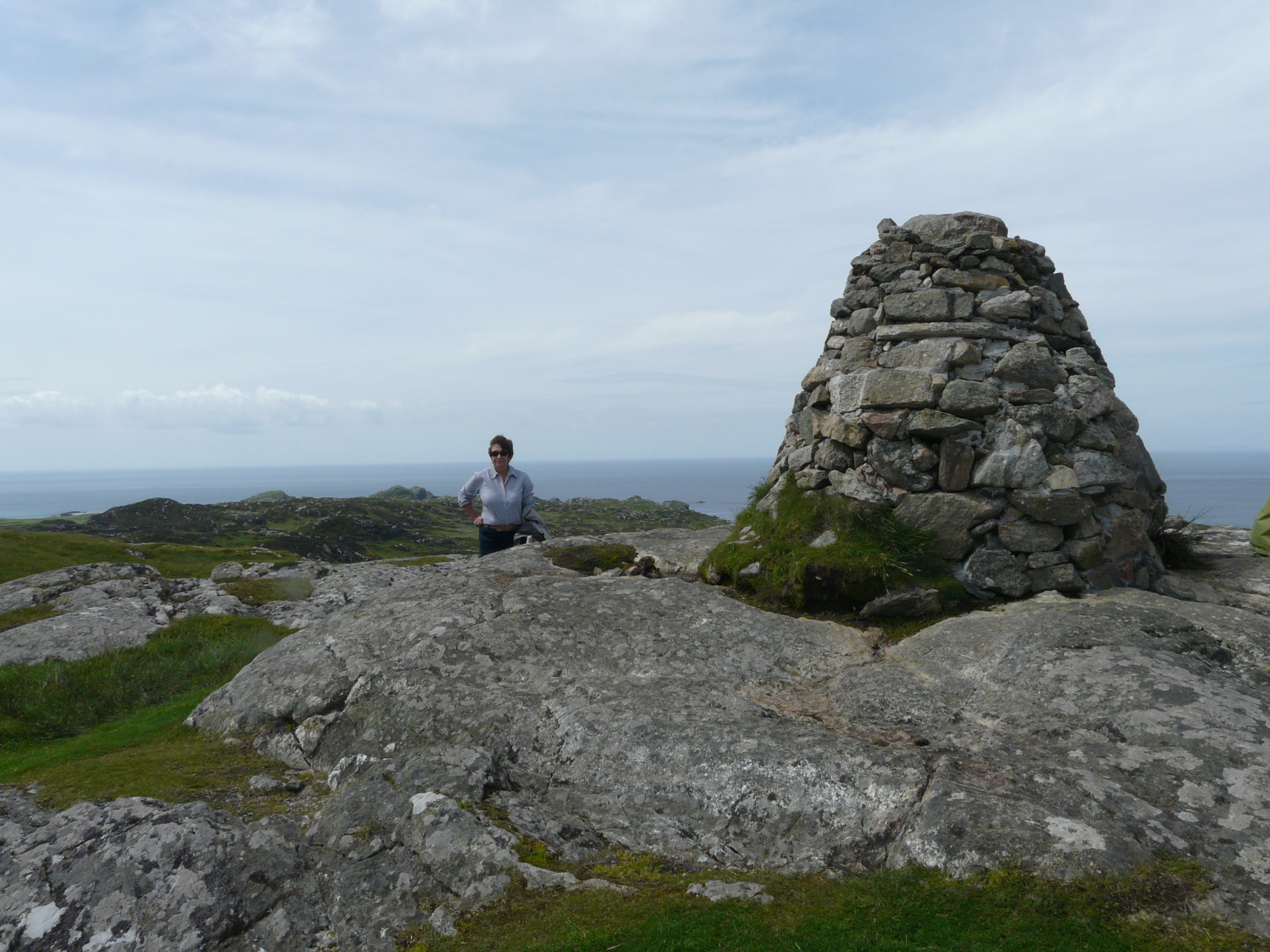 Got up too late to join the seven-hour pilgrimage round the island, but did our own thing. Walked to the Machair, and came upon Anna and Howard. Walked with them to Columba’s Bay, where we had sandwiches. Saw inuksuk/cairn. The rest of the pilgrimage group (including Penny and Ali) were already there, having come a different way. I climbed a little hill on the beach, then the four of us headed up and along the cliffs. We separated from Anna and Howard as quite heavy rain started, and we sheltered about 20 minutes, then climbed up and across quite boggy ground to the loch we had passed earlier. Met Liso, a woman we had met on the train and bumped into several times. Walked back across the Machair golf course and saw whales again; then back to house. Pretty wet, so had shower, then dozed on bed. Had healing session with Penny, and felt good afterwards – interesting sensations in my head: she said there was a lot going on there. Well, yes. Then had a meal at the restaurant on the quay… fish and chips, then pavlova. All just made it to healing service at Abbey at 9pm. Bed soon after. Walked over eight miles today.