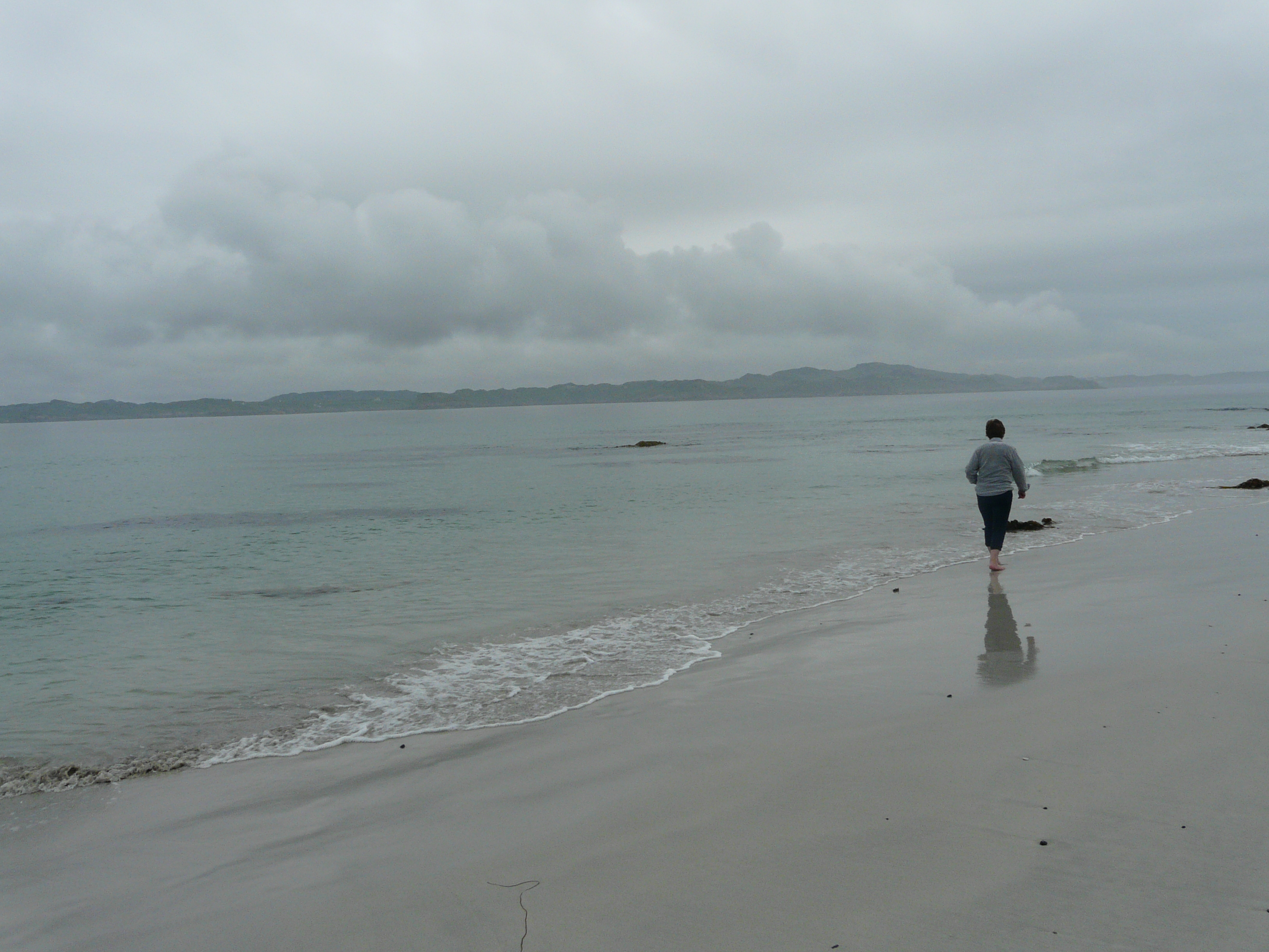Rain and low cloud in the morning, but by lunchtime the rain had stopped, and it was still, though the cloud remained very low. Dot and I walked to a craft and jewellery outlet; in the former we discovered our next-door neighbour and had quite a long chat. In the latter we bought Dot an Iona ring – white with green tendencies. We walked on, and Dot bought coffee. At the end of the road (walking north), we turned left to the beach and then walked round the northern tip to the white sand beach, where Dot paddled. It was warm and still, and the tide was a long way out. On the way back we saw Penny and Ali ascending Dun I. Stopped at house, then went on to the quayside cafe for tea and strawberry tart. Watched Americans being ferried backwards and forward to a huge cruise ship, then back to the house. Meal by Anna.