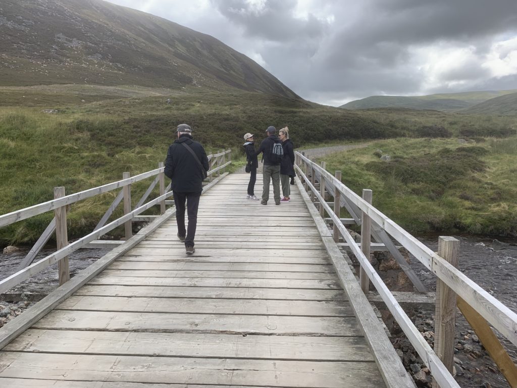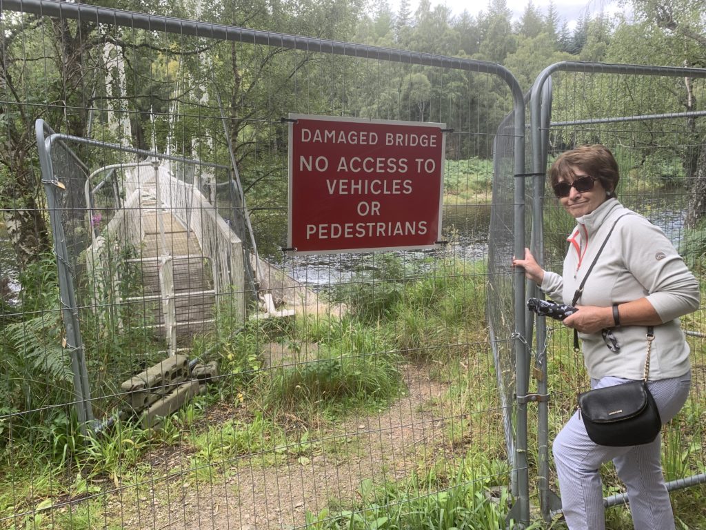 Wednesday 14th: Very cool start, with light rain after breakfast, which we had in Rocksalt and Snails (eggs benedict). Dot and I bought warm tops on our way home after buying meat from butcher’s. Drove to Crathie Kirk and called at the Information Centre, where the Canadians ran amok, then on to Braemar, where we viewed the new, improved Fife Arms. Impressive, but our beloved tea and sandwich lounge is no more. Then on to the new Games Pavilion – made the mistake of letting Roger go first, and they missed the turn; so we had to chase them. Nice scone and tea. Then to Linn of Quoich and more midges. Still worth seeing, though. The main bridge seems to be in the process of demolition. Drove back via the Lochnagar loop, then called at station info in Ballater. Had an Angus burger from the butcher’s. Excellent. Watched Breakfast at Tiffany’s, which I thought was very well done, despite reservations elsewhere.