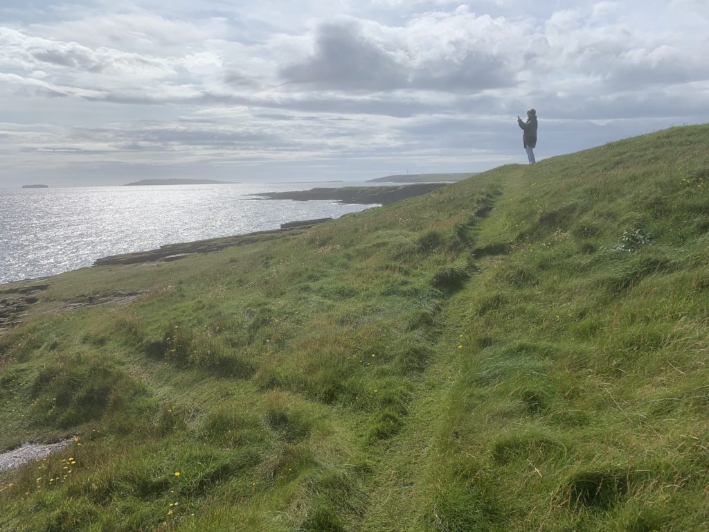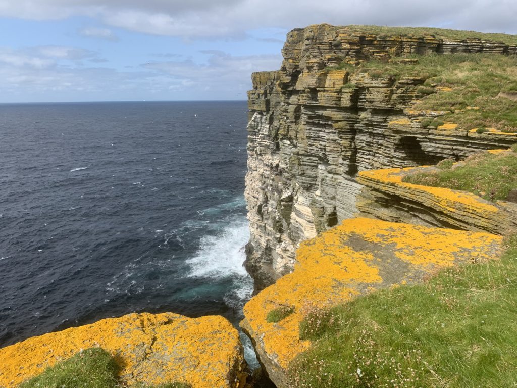 Sunday 18th: Mainly pleasant weather – quite warm but with a couple of heavy showers. Drove to the Italian Chapel and Churchill Barriers, then to Goulp of Deerness – a sea cave/chasm. Lovely cliffs and a visitor centre with loos in the middle of nowhere. Unmanned and undamaged. Walked on cliffs then back to airport to check it out. Then drove past Stones of Stenness to the Ring of Brodgar – walked round it. On to Yesnaby, where we made the mistake of not walking to a point where we could see the sea stack, because it looked like rain. and Dot was very tired. We meant to come back… Still, the cliffs were spectacular. Called at Maeshowe visitor centre on way back to hotel. At hotel had bath, slept a bit, got organised. Scallops and chips.