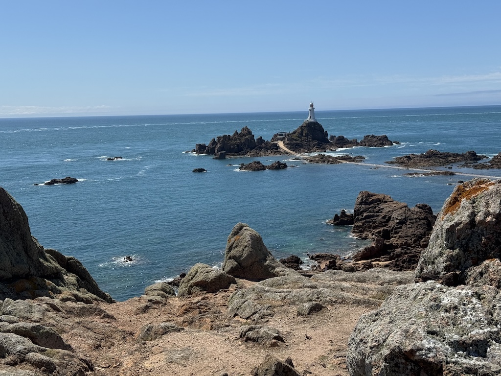 Thursday – Started grey with very slight drizzle, but by mid-afternoon became very warm and sunny. Earlyish breakfast, then tour of island by minibus, driven by witty Scotsman. Went round Jersey anti-clockwise (21 of us), stopping at Gory, then for very nice lunch (best prawns I ever tasted) at an inn, Les Fontaines, on the north coast. After that continued round to Corbière lighthouse and a beach on the south coast, where we stopped for ice cream.
