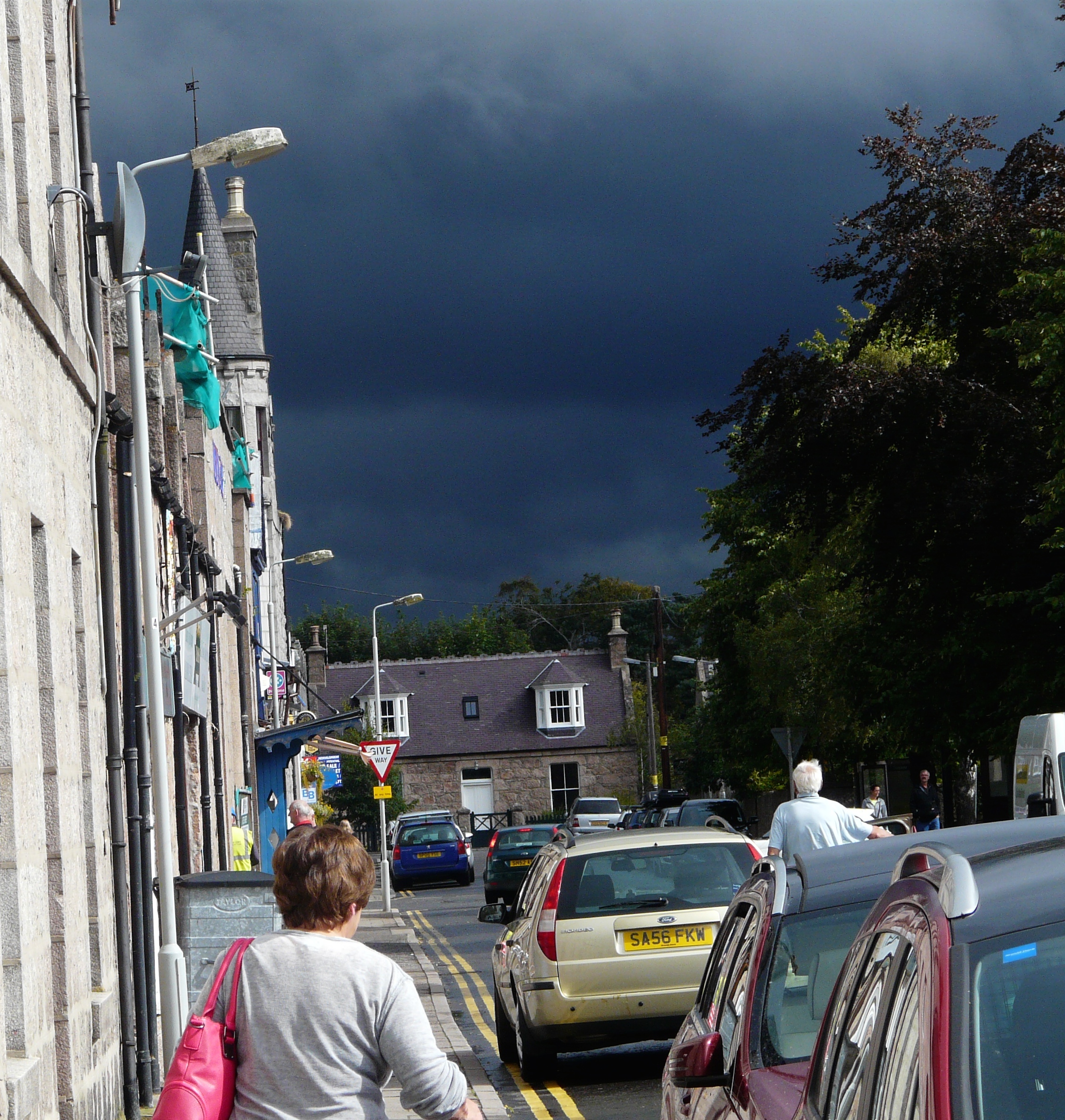 It was warm. We headed up the Crathie-Gairnshiel road, intending to take a short walk down the hill track, but almost as soon as we stopped, another car pulled up beside us and a family of four headed out in the same direction. Not what I had in mind, and there were more threatening clouds building over Lochnagar, so we moved up the road a bit and read. Soon it started raining, and got heavy, with a fierce wind. I could see through the binoculars the family down in the valley getting a soaking, and was glad I was not them.