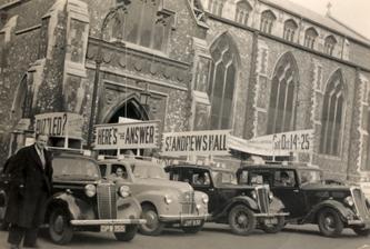 This picture was taken in 1950, when I was five. My father’s car is on the left, and St Andrew’s Hall is in the background. I think I have a faint memory of the event – may even have been in the car as it paraded round the city – but I can’t be sure. When the picture is blown up, there seems to be someone sitting in the passenger seat of the Vauxhall, but it’s too faint to make out.