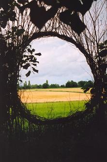 This is a rather lovely work of art composed of hazel branches and on show at the Welborne Festival. Provides a nice frame for a shot of the mid-Norfolk countryside.