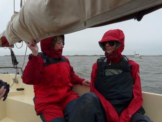 Dot and Barbara suitably attired for sailing in Blakeney harbour, and a little concerned that they should have had bespoke versions.